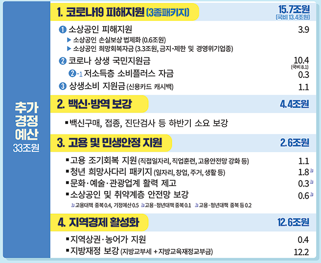 기획재정부에서 5차 재난지원금 신청 추가 예산안이 확정되었습니다. 이번 코로나 극복을 위한 상생 및 피해회복의 일환으로 33조원 규모의 지원이 이루어진다고 하니 본인의 해당사항을 잘 파악하셔서 신청하시기 바랍니다.
