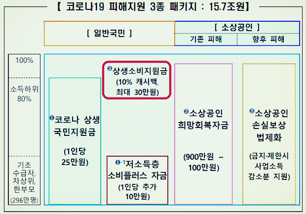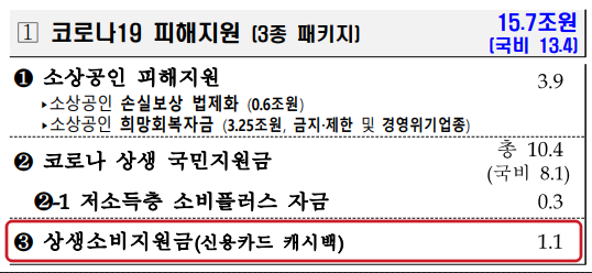 우리 경제의 내수를 회복하기 위한 목적으로 하반기 신용카드 사용 증가분의 10%를 캐시백으로 환금하는 것을 말합니다. 코로나19 피해지원 3종패키지 중 3번째로 1.1조원이 지원됩니다.